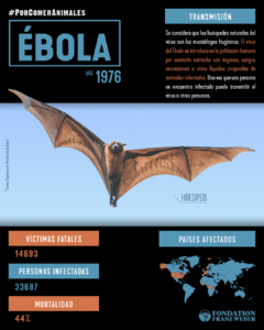 Origen: El ébola es una enfermedad de origen zoonótico, es decir, transmitida de animal a humano. Los datos sugieren que los murciélagos frugívoros (de la familia Pteropodidae) podrían ser los hospedadores originales (Han et al. 2015). Según la OIE, el virus del ébola se transmitió a humanos a través del contacto con animales salvajes por medio de actividades como la caza o el consumo de carne cruda de animales (OIE). De hecho, el virus del ébola ha sido detectado en especies como primates no humanos y pequeños antílopes salvajes denominados cefalofinos.